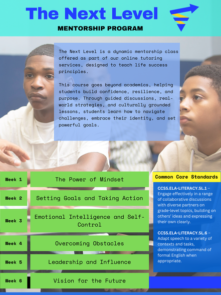 The Next Level is a dynamic mentorship class offered as part of our online tutoring services, designed to teach life success principles. This course goes beyond academics, helping students build confidence, resilience, and purpose. Through guided discussions, real-world strategies, and culturally grounded lessons, students learn how to navigate challenges, embrace their identity, and set powerful goals. The Next Level is about growth—mentally, emotionally, and culturally—equipping young people to rise above limitations and step boldly into their full potential.